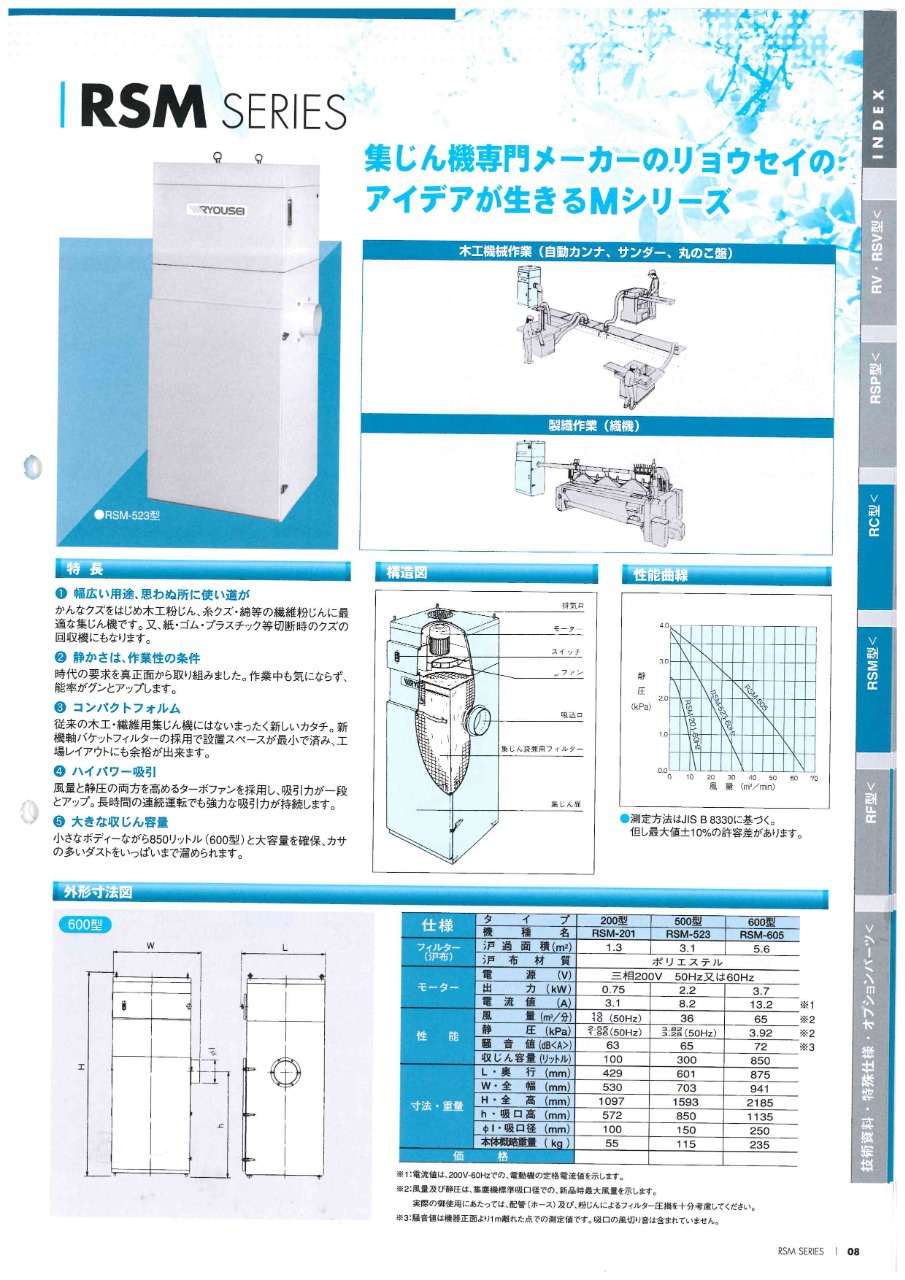 RSMシリーズは、自動カンナやサンダー、丸のこ盤など、木工機械用として使いやすい集塵機です。現場でよくある作業を前提に作られているので、無理のない構造になっています。