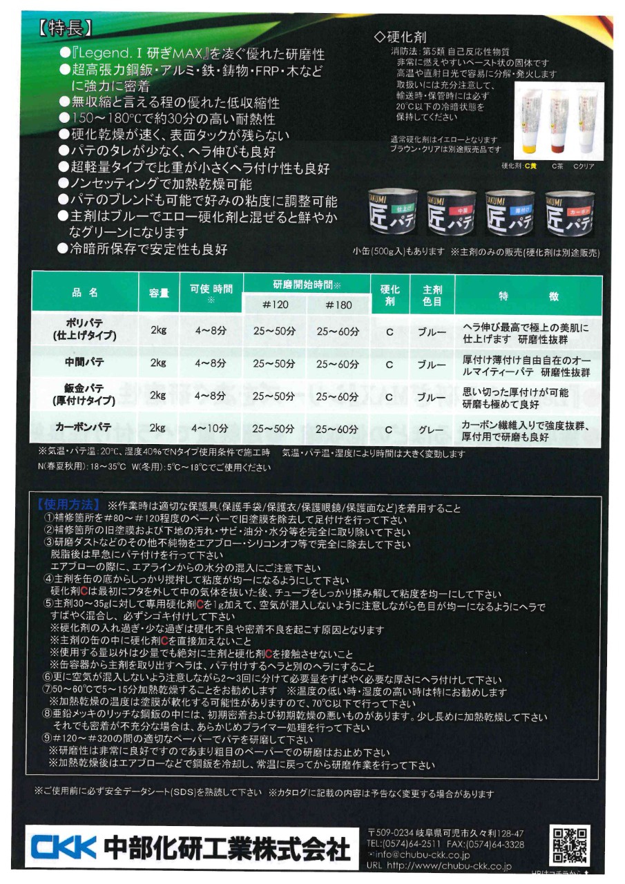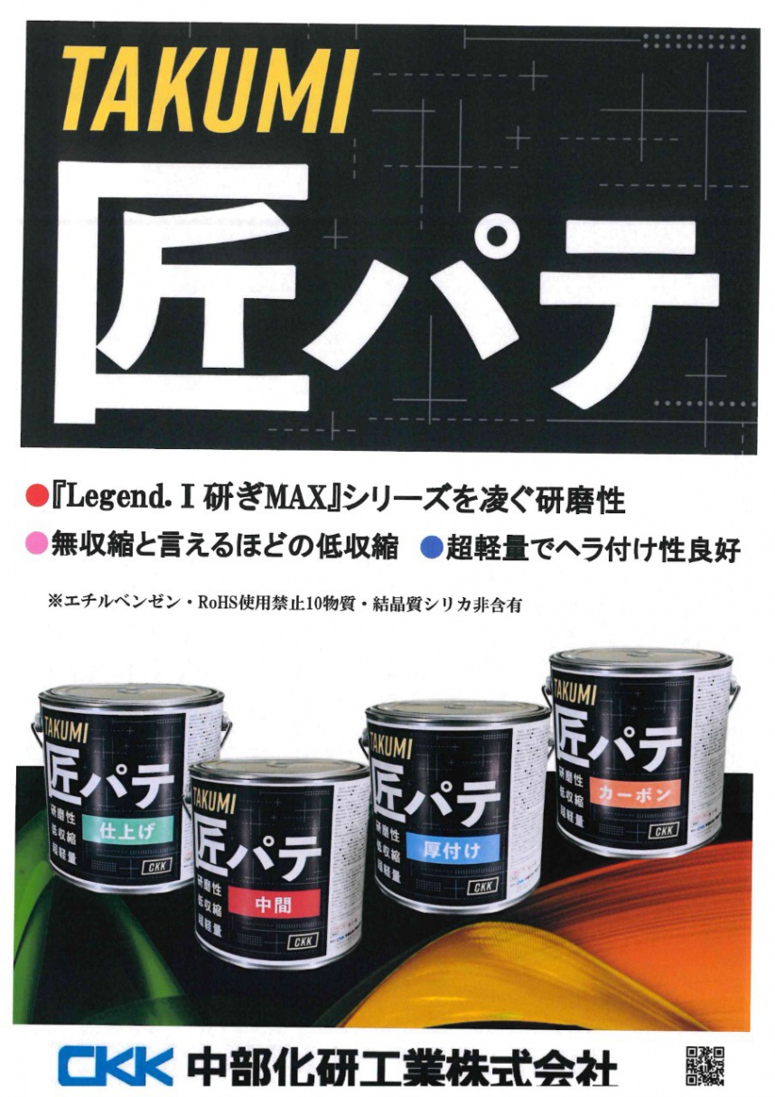 今日は、中部化研さんから新しく発売された「匠パテ(TAKUMIパテ)」をご紹介します。カタログを見た瞬間に「これ、使いやすそう!」と感じた商品です。