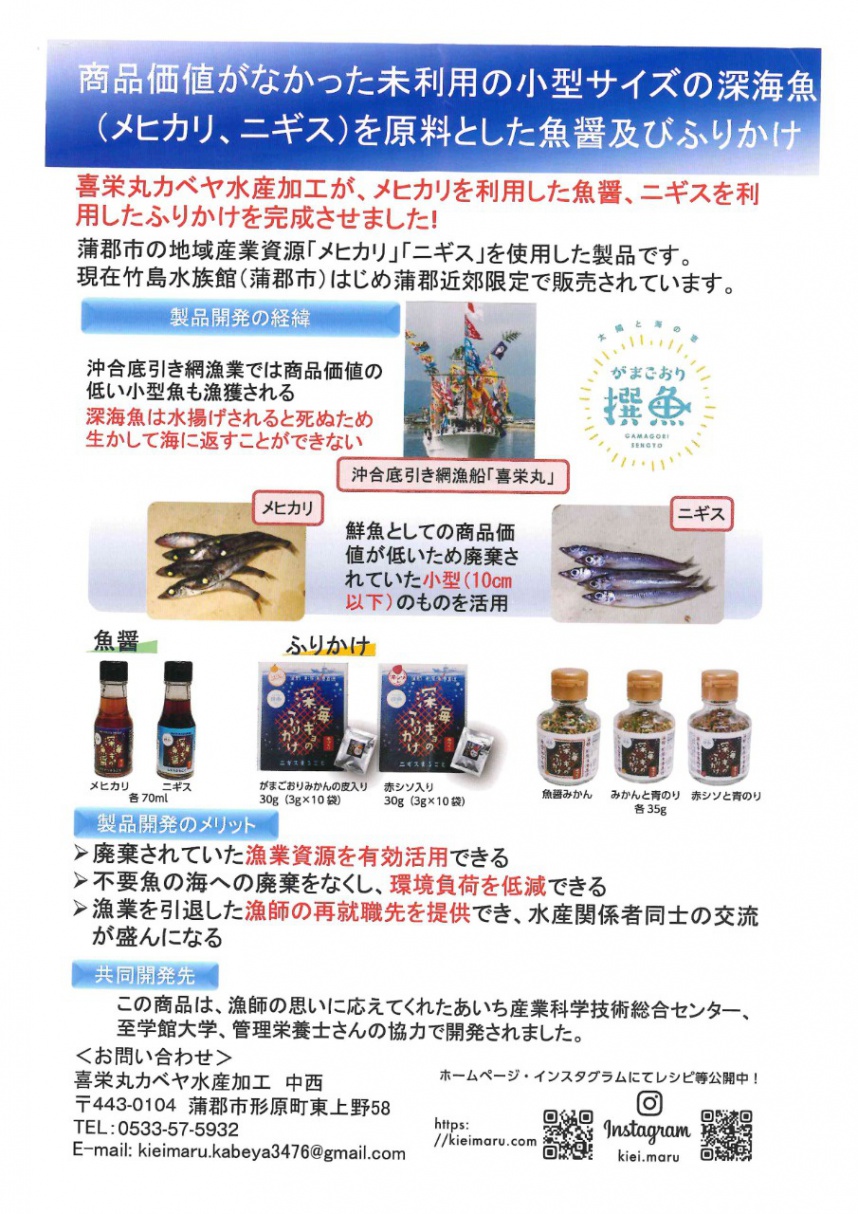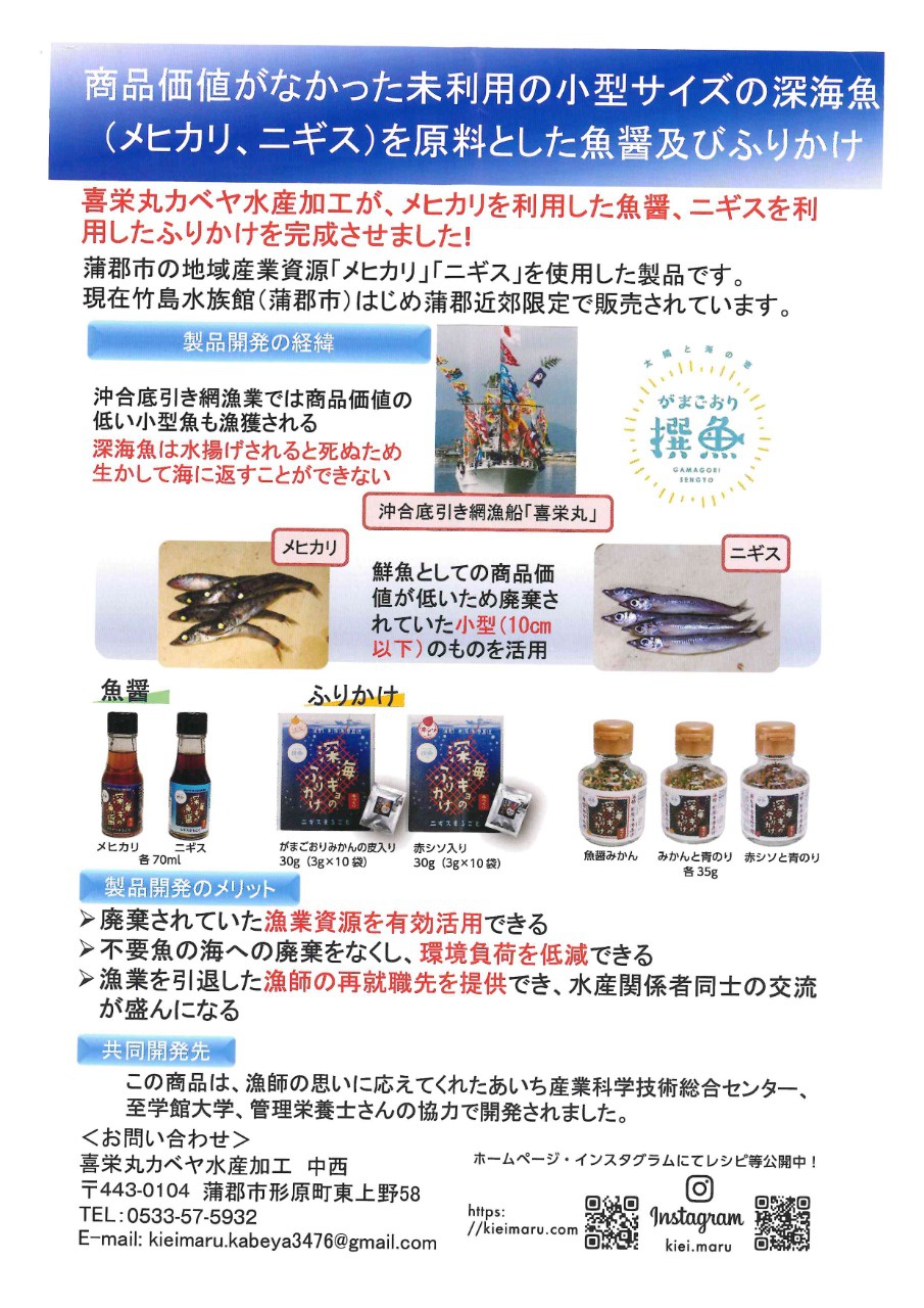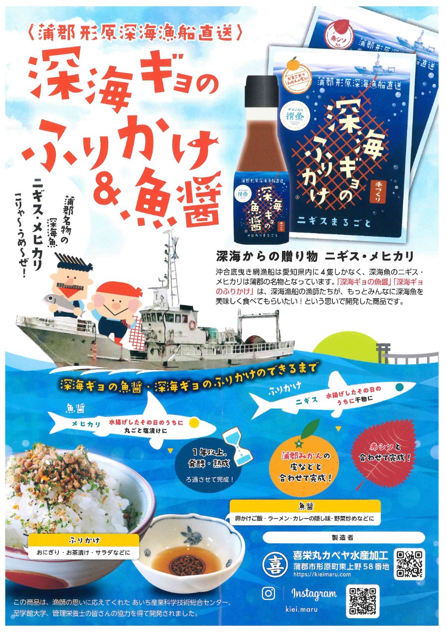 喜栄丸さんは、愛知県蒲郡市で深海魚を使ったユニークな加工品を製造している会社です。地元の底引き網漁で獲れる“メヒカリ”や“ニギス”など、小型で商品価値が低いとされてきた魚を有効活用し、「深海ギョのふりかけ」や「深海ギョの魚醤」として商品化されています。